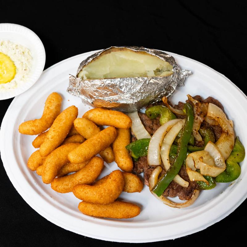Served with slaw, French fries, or baked potato, hushpuppies, or rolls.