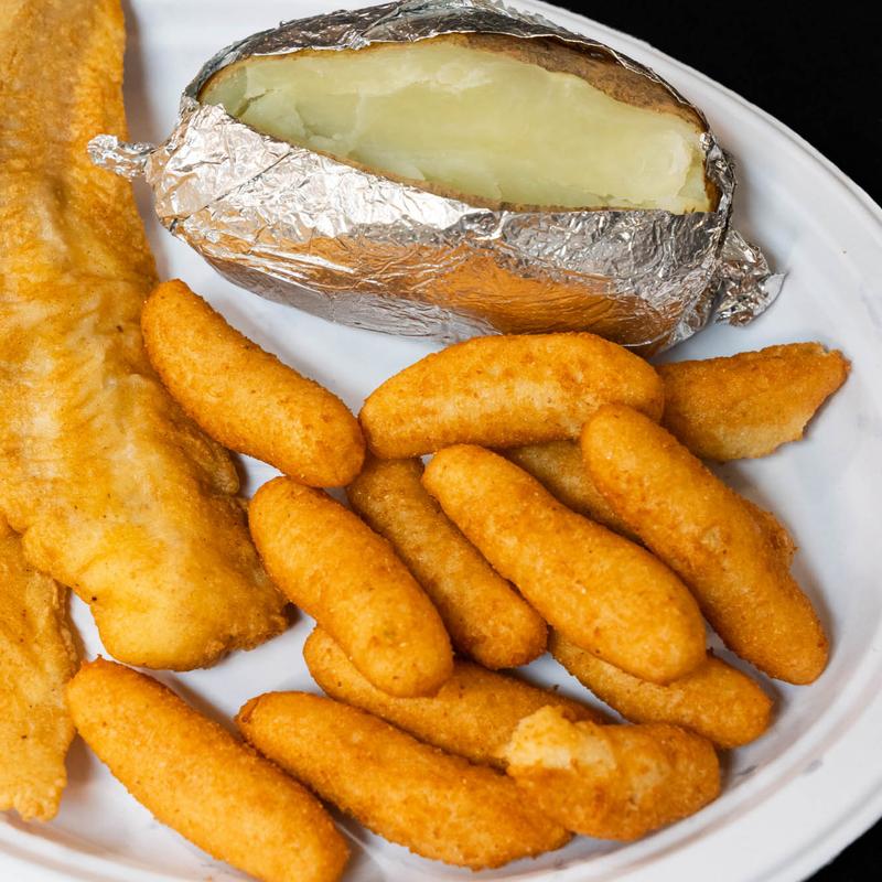 Served with slaw, French fries, or baked potato, hushpuppies, or roll.